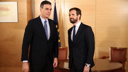 Tras un saludo gélido, el presidente del Gobierno en funciones y el líder del PP se han sentado a hablar esta mañana por primera vez desde las elecciones del pasado 10 de noviembre. El encuentro duró apenas 40 minutos —Mariano Rajoy y Pedro Sánchez llegaron a estar solo 20 en una reunión similar en 2016— y dejó pocas sorpresas. En la rueda de prensa posterior, cuyo comienzo se demoró hasta una hora después del fin de la reunión, Pablo Casado ha reiterado su negativa a facilitar la investidura del líder socialista: "El PP no puede ser el partido que blanquee el pacto con Podemos", a los que también se refirió como "los comunistas". Sería como pedirle a Pedro Sánchez que facilitara un Gobierno en el que Vox tuviera la vicepresidencia", ha dicho. Favorecer un Ejecutivo del PSOE y Podemos, añadió, sería "letal para España y un suicidio para el partido". "Si hacemos eso, miles de militantes romperían el carné del PP", han añadido posteriormente fuentes de la cúpula popular.