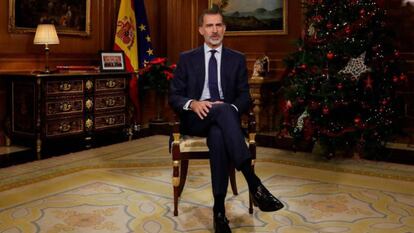 El rey Felipe VI ha lanzado este martes un mensaje de “confianza firme en España” y en “la fortaleza de su sociedad”, en tiempos que “no [son] fáciles”. Tiempos, ha dicho en su discurso navideño, “de mucha incertidumbre”, en los que, a problemas globales como el cambio climático o la revolución digital, se suman en España “otras serias preocupaciones: el deterioro de la confianza en las instituciones y, desde luego, Cataluña”. Frente a ello, ha pedido “no caer en los extremos” y ha llamado a “integrar las diferencias”, respetando una Constitución “que reconoce la diversidad territorial y preserva la unidad”.