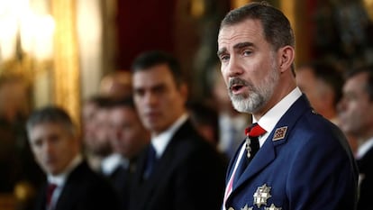 En presencia del presidente en funciones, Pedro Sánchez, y de los ministros de Defensa e Interior, Margarita Robles y Fernando Grande-Marlaska, Felipe VI, con uniforme de capitán general del Ejército del Aire, se ha dirigido a unos 150 militares, reunidos en el Salón del Trono del Palacio Real, para expresarles su “más sincero orgullo y reconocimiento, por el impecable desempeño” de su tarea. “Sabéis mejor que nadie”, les ha dicho, “que garantizar la libertad y la seguridad de los españoles es una misión fundamental para el desarrollo y bienestar de nuestro país”.