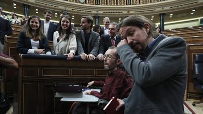 Las lágrimas de Iglesias fueron la primera respuesta incontenible del que ahora siempre aparece en público como un hombre contenido. En medio de un escenario político crispado hasta el insulto, Iglesias impone su tono moderado y su voz monocorde. Apela a la Constitución, al respeto y al Rey si es necesario. Aplaude las palabras de Sánchez y de Íñigo Errejón, cuya marcha del partido hace un año amenazó con romper Podemos. Se presenta como un hombre de Estado y ni siquiera eleva la voz cuando la hemeroteca le recuerda que hace apenas cinco años prometía acabar con el “régimen del 78”. Asume con naturalidad sus propias contradicciones. Sería “más cómodo” quedarse en la oposición “con la pandereta defendiendo al 100% nuestro programa y no estar en las decisiones”, declaró hace unos días en La Sexta. Pero él ha preferido estar. A esa apuesta puso todas las fichas este último año. “Habrá que afrontar muchas contradicciones, pero está en un punto de madurez personal y política que será capaz de relativizar todo eso. Lo veo fuerte”, cuenta Jaume Asens, su amigo desde hace 20 años y portavoz de En Comú Podem.