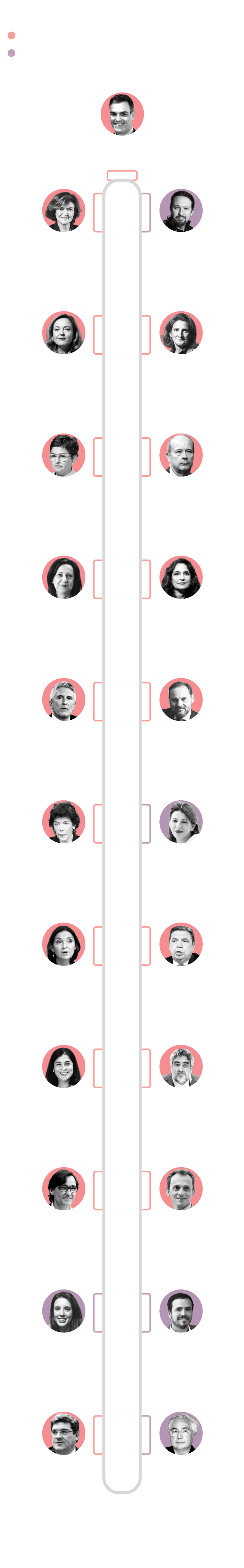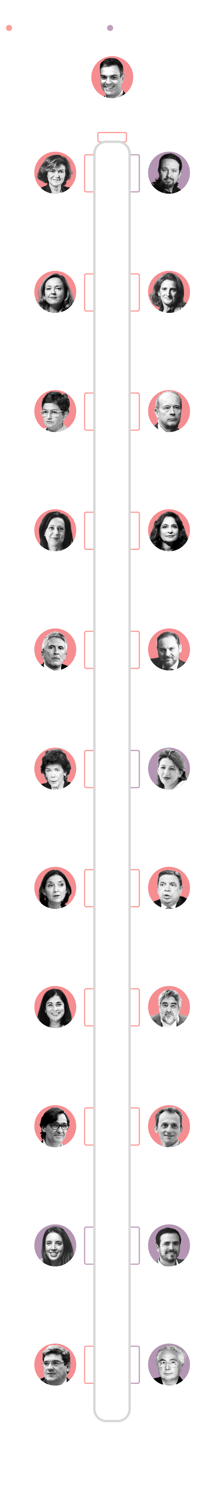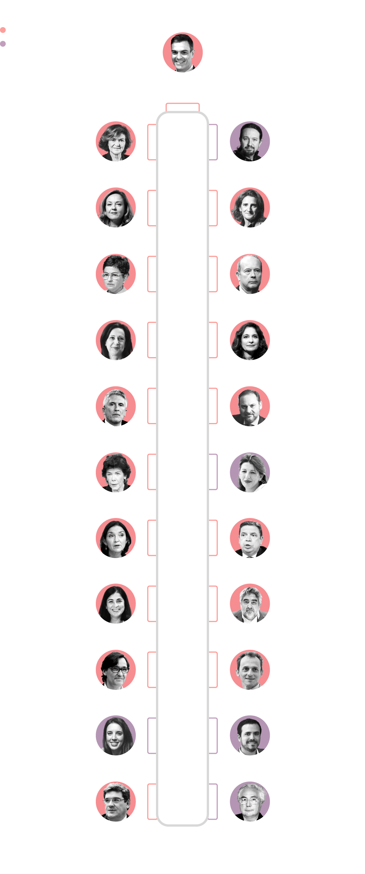 En primera fila seguían la comparecencia tres ministros socialistas, incluida la vicepresidenta, Carmen Calvo, y el núcleo duro del Gabinete de Sánchez, con Iván Redondo, Félix Bolaños y José Manuel Albares. Pero no estaba allí el vicepresidente segundo, Pablo Iglesias, gran protagonista de la jornada del primer Consejo de Ministros, en el que se sienta a la izquierda del presidente. Después de todo lo que se dijeron en los últimos meses, y de que Sánchez insistiera en que él era el gran obstáculo para que hubiera una coalición, ahora el presidente asegura que, con el pacto que se ha cerrado, no tiene “ninguna reserva” con Iglesias y con el acuerdo alcanzado con Unidas Podemos. “Al contrario, estoy orgulloso. Es cierto que es una experiencia inédita, pero todos los ministros lo son ya del Gobierno de España y no de un partido político”, ha rematado.