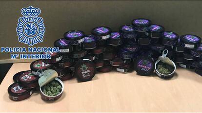 La policía ha informado en un comunicado que este tipo de envases —en lata y con fotos de cáñamo en su frontal— se están distribuyendo internacionalmente aprovechando la legalización del comercio de semillas de sustancias similares, a las que se les ha eliminado el principio activo (THC).