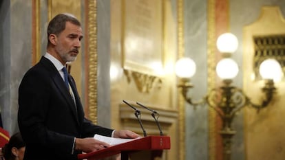 La división actual del Parlamento, que ya se evidenció en el bronco debate de investidura de Pedro Sánchez, ha estado presente en el discurso del Rey: “La Constitución es el lugar de encuentro de los diferentes modos de sentir España”, ha dicho a los diputados y senadores, a los que ha reclamado “diálogo y generosidad”. “La esencia del parlamentarismo es el acuerdo”, ha subrayado.