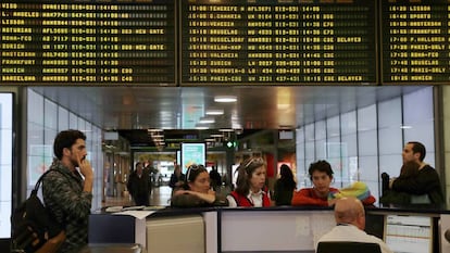 Ana de Pedro, de 48 años, esperaba a su hija. El aterrizaje de su avión, que despegó de Roma, estaba programado a la 1.30. “Me enteré por ella, cuando al fin dieron autorización de aterrizar [sobre las 13.50] y me mandó un whatsapp”, comenta mientras muestra el grupo de su familia en el móvil. De Pedro, al igual que el resto de la gente que esperaba a sus amigos y familiares en el aeropuerto, no se enteró por los altavoces de que el espacio aéreo estaba cerrado. “Fui a información a preguntar qué pasaba y me remitieron a Ryanair, ahí me lo dijeron todo. Es alucinante”, sentencia mientras las puertas que dan con la zona para recoger el equipaje se abren y se reencuentra con su hija.