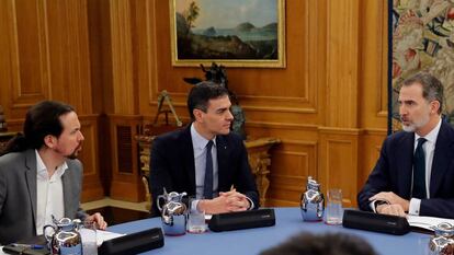 Antes de comenzar la reunión se ha podido ver cómo Felipe VI conversaba con Sánchez, sentado también a su derecha, y con Pablo Iglesias, que a su vez ha ocupado el asiento a la derecha del jefe del Gobierno.