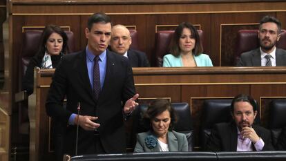 Sánchez tiene muy claro que es importante convencer al mundo político, en especial a la oposición, de que el Gobierno logrará aprobar los Presupuestos y por tanto estará varios años. Tanto que ha insistido sobre este asunto en su respuesta a la líder de Ciudadanos. "Tenemos cuatro años por delante, señora Arrimadas. Sean un partido de centro, no un partido que acompaña a la derecha". También el cruce entre Carmen Calvo y Cayetana Álvarez de Toledo giró alrededor de Cataluña y el tono de oposición que ha elegido el PP. "Ustedes insisten en alternar con delincuentes. Y ahora quieren reformar el Código Penal para borrar el delito de lesa democracia que han cometido al pactar el gobierno con un condenado por delito de sedición [Oriol Junqueras]", lanzó Álvarez de Toledo. "Ustedes fueron un partido de Estado, pero ya no lo son, señor Casado", le contestó Calvo mirando al líder del PP, sentado al lado de su portavoz. "Tienen un discurso contra Cataluña. Por eso no tiene ningún respaldo electoral allí", remató la vicepresidenta.