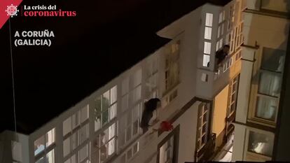 Fue Daniel quien propuso la idea. "¿Por qué no nos casamos por la ventana?", dijo. Porque en todas las bodas, además de un par de novios, hacen falta testigos y un maestro de ceremonias. Le pidieron a una vecina del edificio de enfrente que los grabara y otro del piso de al lado se ofreció para oficiar el casorio. Con el jaleo se fueron sumando algunos curiosos. Cada uno desde su propio aislamiento, asomados a sus galerías y balcones como si fueran palcos de un teatro en la oscuridad de la noche. El traje de novia aún estaba en Lugo, así que Alba se conformó con ponerse la bata blanca que se había hecho para cambiarse el día de la boda.