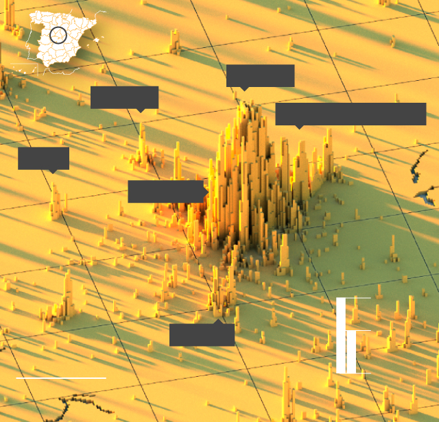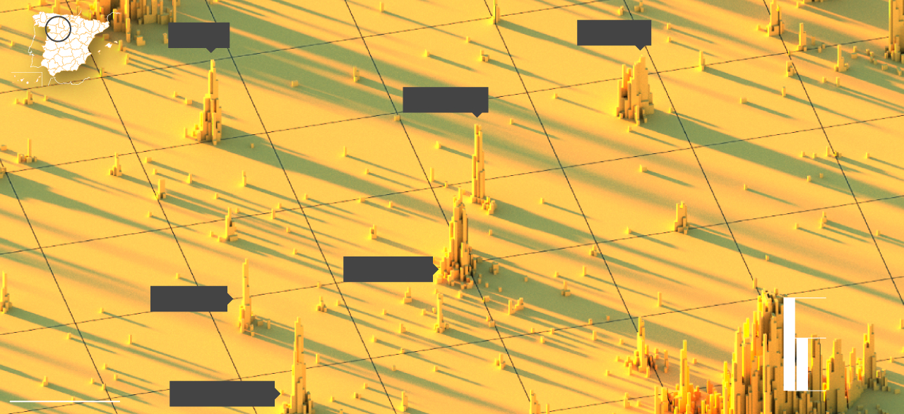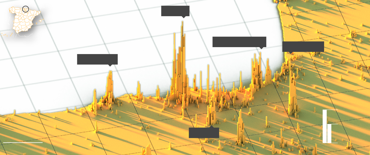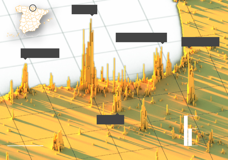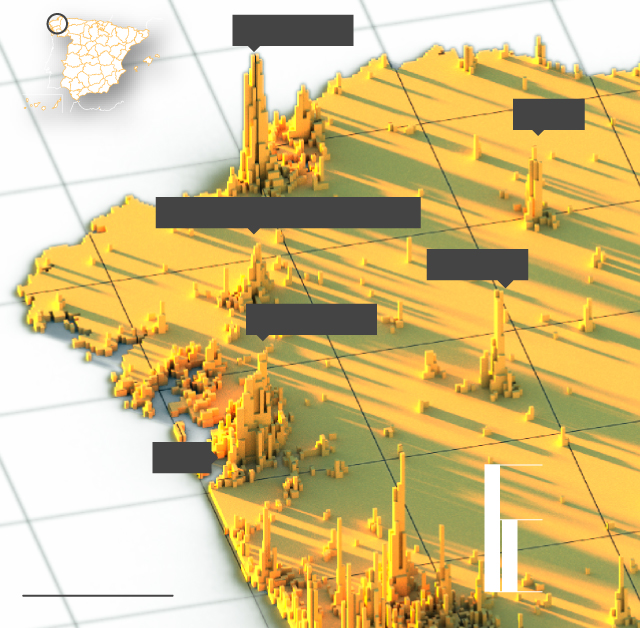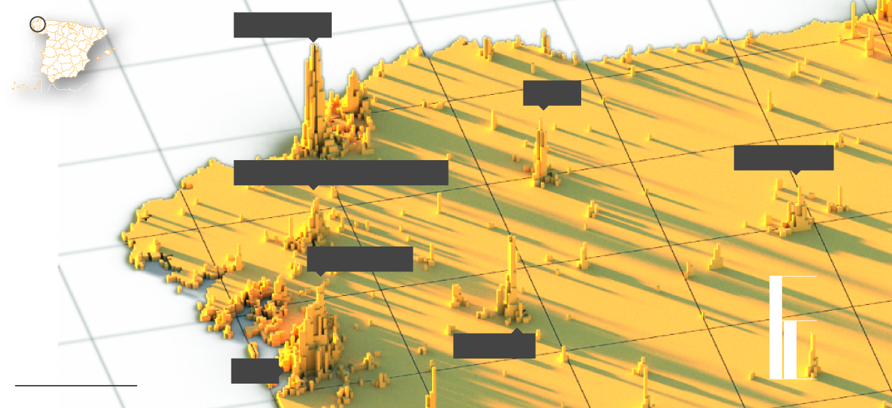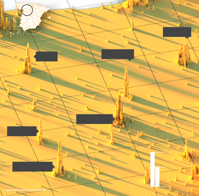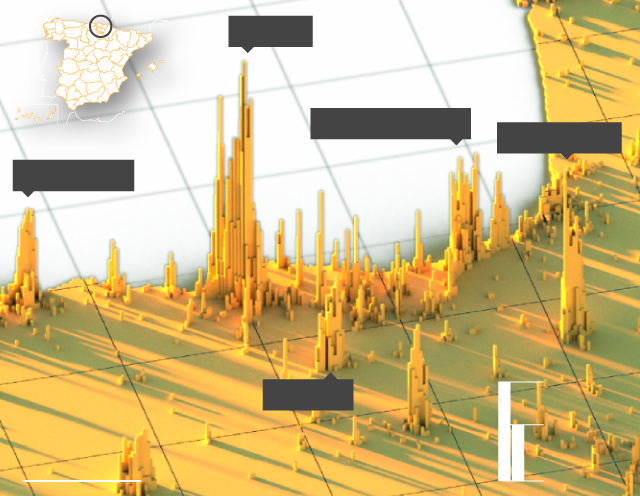 Una visualización con 'rascacielos' de personas muestra el enorme desequilibrio de población entre los diferentes territorios de la península Ibérica