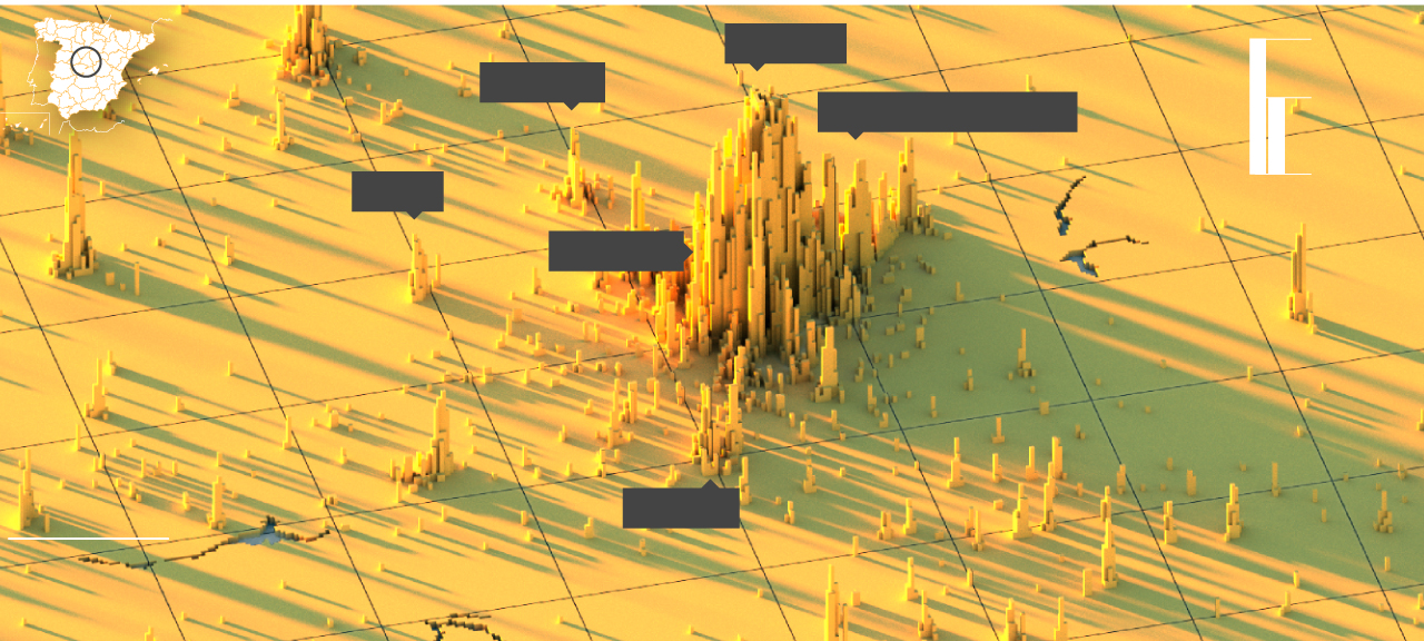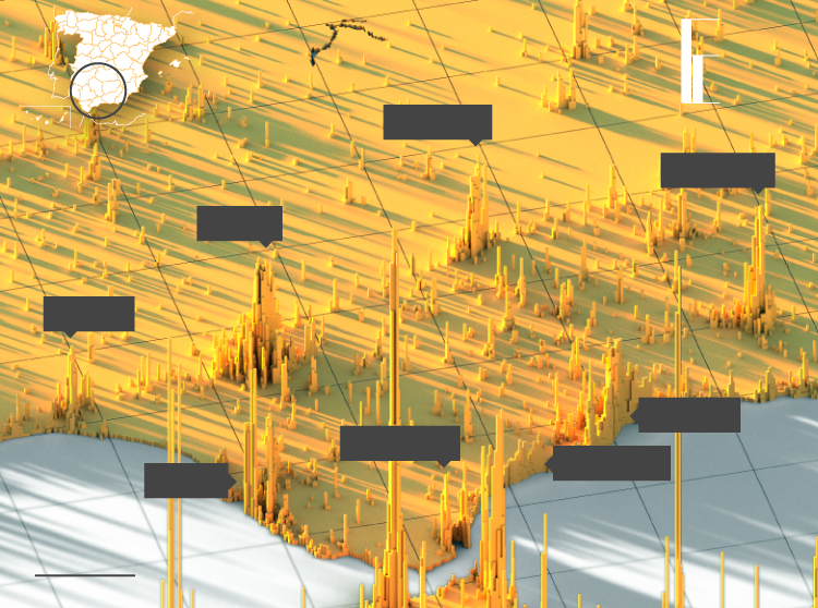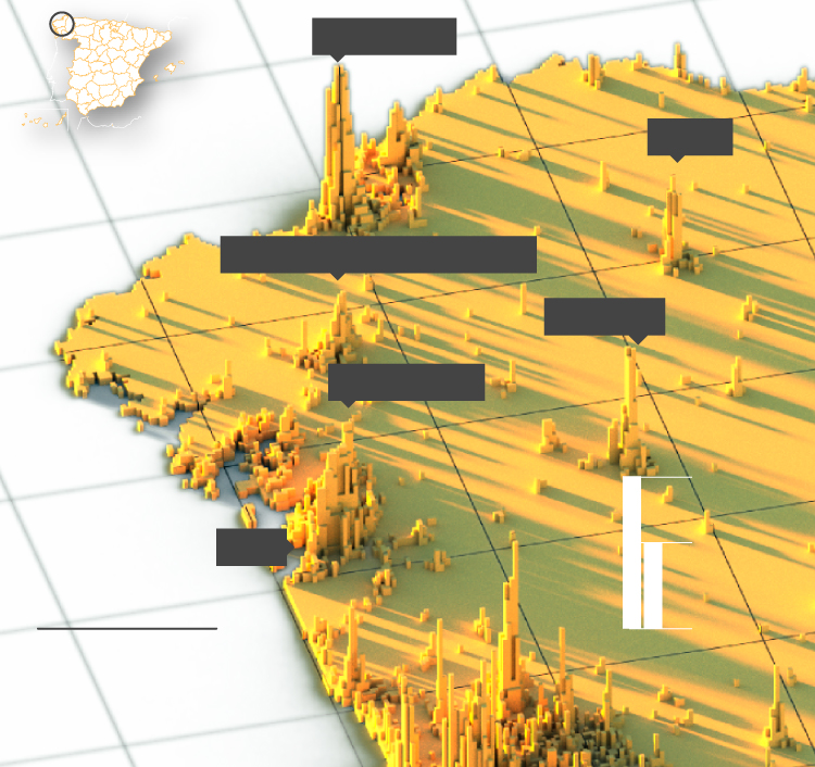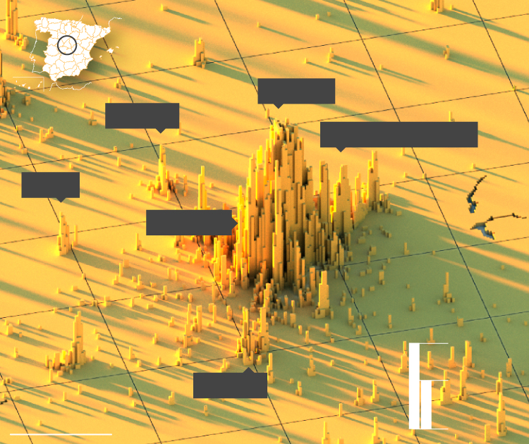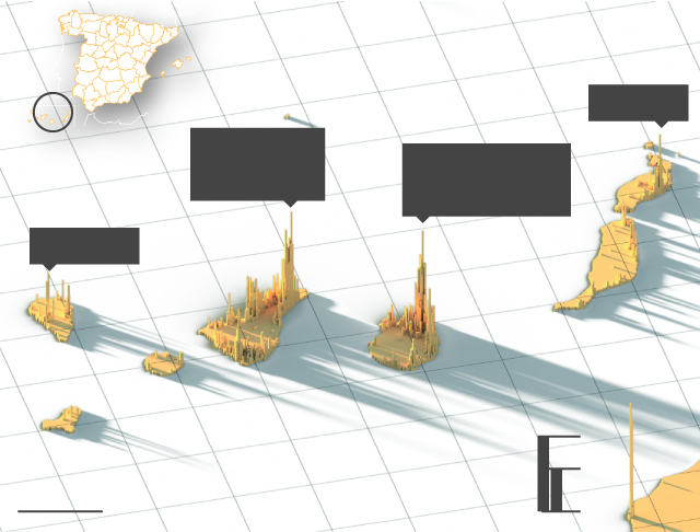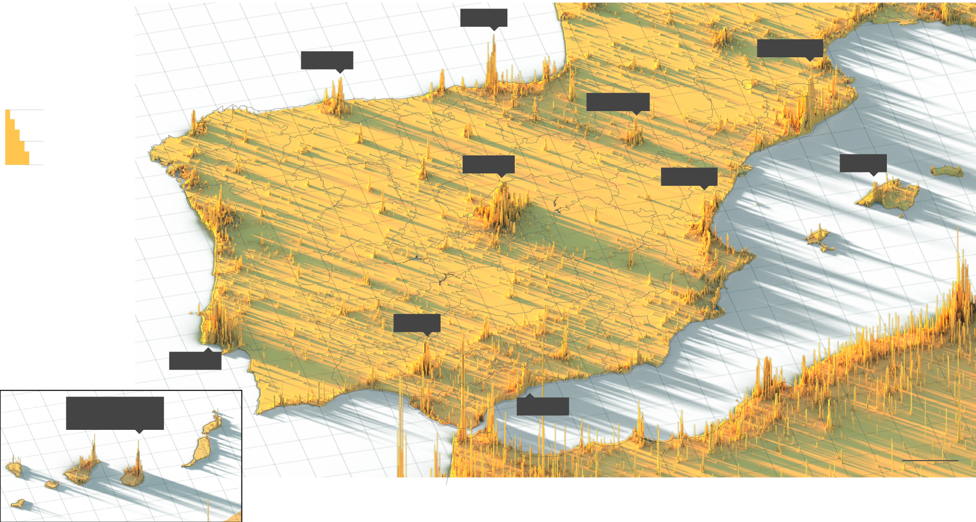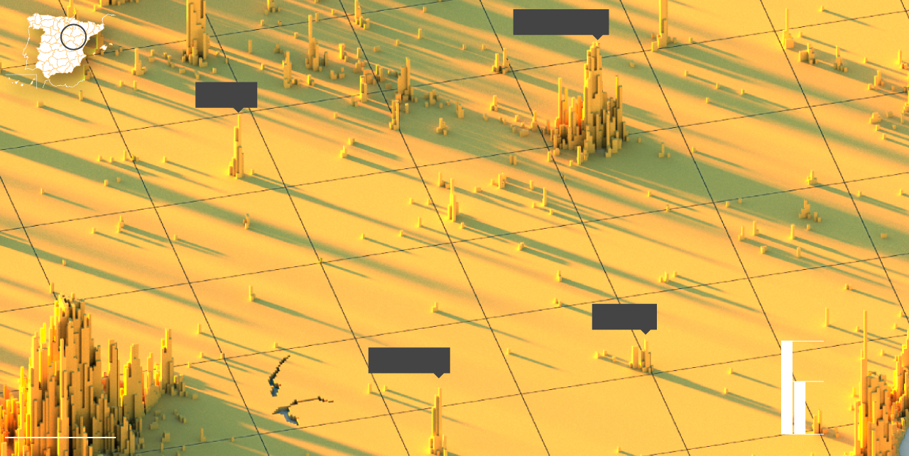 Una visualización con 'rascacielos' de personas muestra el enorme desequilibrio de población entre los diferentes territorios de la península Ibérica