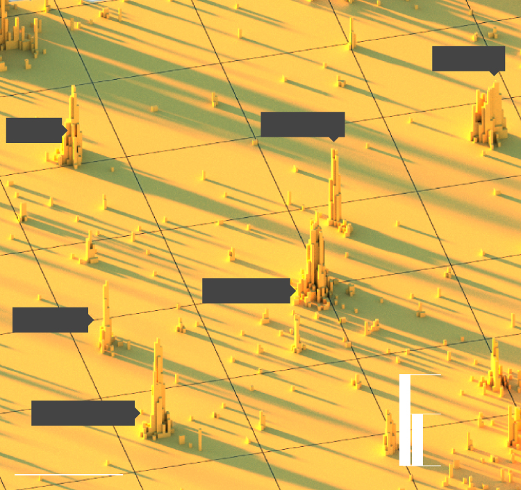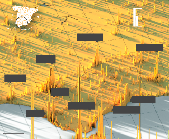Con esta idea en mente, pensó en una manera gráfica de mostrar el fenómeno de la concentración de habitantes en Europa. En lugar de usar la clásica escala de colores para representar la densidad de población, recurrió a unas barras verticales, colocadas una por cada celda de un kilómetro, unas barras que dibujaría tanto más altas como más habitantes contuviera la celda. Así surgieron unos peculiares mapas en 3D, llenos de finos rascacielos de personas.