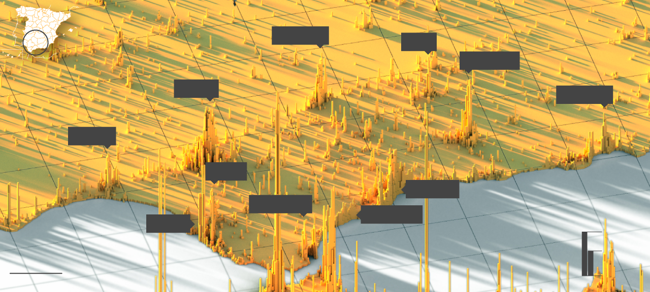 El resultado del trabajo de visualización del profesor inglés muestra en el caso de España la existencia de dos fenómenos demográficos claros: por un lado, se ve cómo se concentra un enorme volumen de personas en grandes centros urbanos; por otro, la innegable existencia de grandes extensiones de terreno apenas habitadas. Recorramos con varios ejemplos ampliados las características de la España abarrotada y la España vacía.