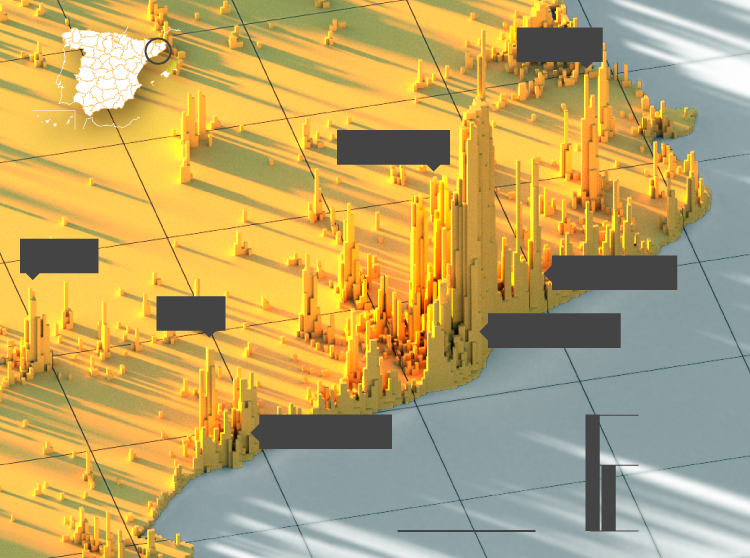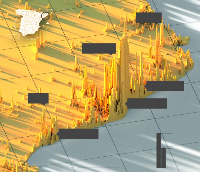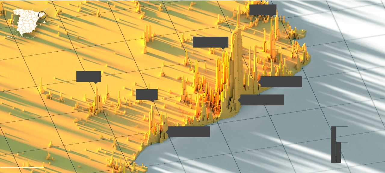 De todas las áreas metropolitanas españolas, la de Barcelona es la que más municipios tiene: 165. En ella, además de la capital, otras seis localidades superan los 100.000 habitantes. La concentración de población en la cercanía del mar queda patente en esta visualización, con una especie de pared que recorre gran parte de la línea de costa de Cataluña. Volver arriba