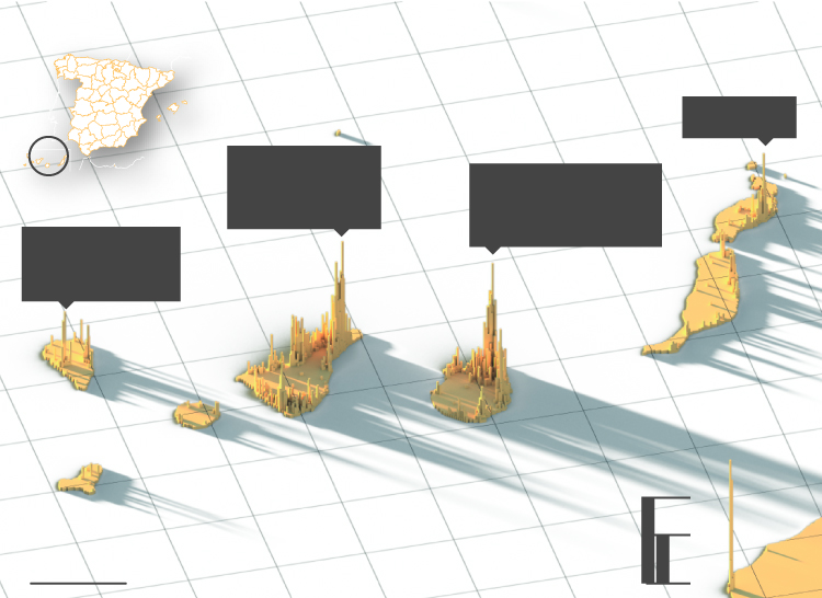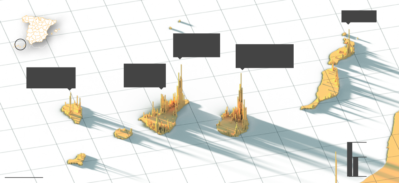 La visualización de Alastair Rae ayuda a ver la enorme disparidad de la población de las islas, donde destaca el nordeste de Tenerife y de Gran Canaria como grandes centros urbanos. Volver arriba