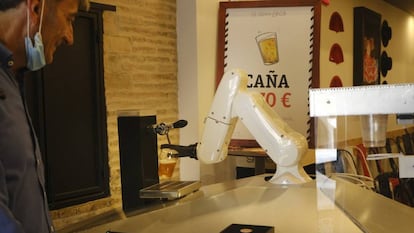 El gitano loco, como han bautizado al brazo robótico que sirve cañas desde el pasado lunes en un céntrico local de Sevilla, ha causado sensación. A pesar de la lluvia, que cae intermitente desde el lunes en la capital andaluza, el autómata no ha parado de recibir visitas y ser protagonista de vídeos y fotografías. El robot se ha convertido en aséptico camarero en tiempos de coronavirus. Creado por la empresa sevillana Macco, tira una caña y la ofrece al cliente en vaso de plástico, evitando así cualquier contacto con otra persona.