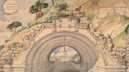La historia de la plaza de España —la mayor de Madrid en su momento— es la historia del enorme hueco que dejó un edificio imponente. Y también la del ingenio de un arquitecto que quiso dotar a la ciudad de un lugar de reunión monumental, pero también práctico. Quería que conectara con el centro la Estación del Norte, angosta y encajada en una franja bajo el monte, a la que llegaban cada vez más viajeros para probar fortuna en una ciudad donde los tenderos iban quedando rezagados ante el poderío de los industriales.