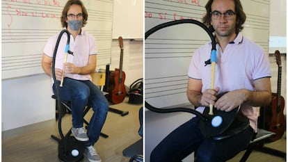 El artífice de la idea es Néstor de San Lázaro, un profesor de música del instituto Ramón Arcas Meca, que asegura a EL PAÍS que su invento, como casi todo en la vida, “surge de la necesidad de dar solución a un problema”. Si los alumnos no iban a poder soplar en clase, había que buscar otra forma de meter aire en el instrumento y lo que se le pasó por la cabeza fue hacerlo con un inflador de pie, de los que se pueden comprar en cualquier tienda de deportes por menos de 10 euros para, por ejemplo, hinchar colchonetas.