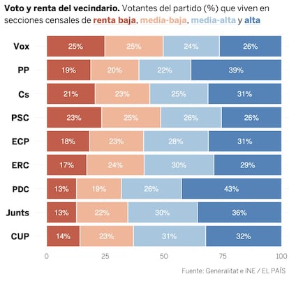 - Vox es el partido cuyos votos salen de barrios pobres en mayor proporción. Una cuarta parte de todas sus papeletas llegaron de allí. Solo se le acerca el PSC, con un 23%. Esos vecindarios de rentas bajas solo aportan un 17%-18% de los votos de ERC.