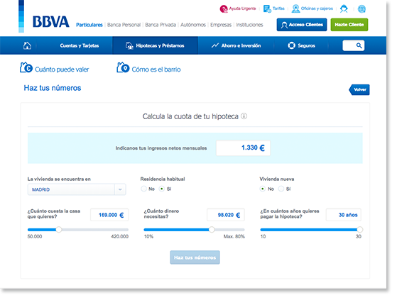 BBVA VALORA nos propone el abanico de productos hipotecarios que mejor se adaptan a nuestra compra, pero también nos ayuda haciendo proyecciones sobre nuestra economía doméstica. Así, podemos comprobar cómo afectaría el pago de las cuotas a nuestra economía en hipotéticos escenarios, como un aumento del Euribor o una bajada de ingresos.