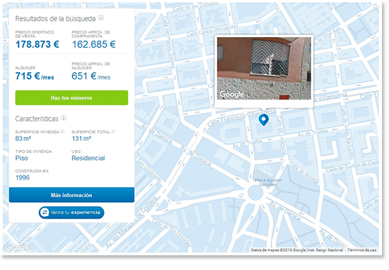BBVA VALORA, desarrollada por Madiva Soluciones, cuenta con información específica sobre millones de inmuebles. Así, el potencial comprador solo tiene que introducir la dirección de la vivienda deseada en “Cuánto puede valer” para obtener, además de sus características técnicas, un precio orientativo de venta y alquiler. Además, BBVA VALORA es capaz de calcular un margen de negociación, ofreciendo lo que podría considerarse un buen precio final de compra.