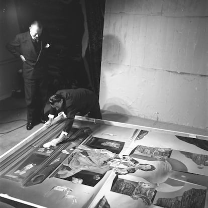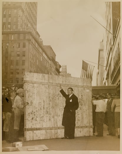 La Madona no va acabar al fons del mar, però va estar a punt d’estavellar-se contra una vorera de Nova York: la galeria Carstairs, on es va exposar per primera vegada, era en un sisè pis. La mida de la pintura va impedir pujar-la al muntacàrregues i va caldre entrar-la per una finestra després d’hissar-la amb una corda; un procés que Dalí va patir des del carrer, com va captar Mark Kauffman, les fotografies del qual també s’exposen. “Ha estat més fàcil pintar-la que transportar-la”, va dir Dalí després d’aquesta experiència angoixant.