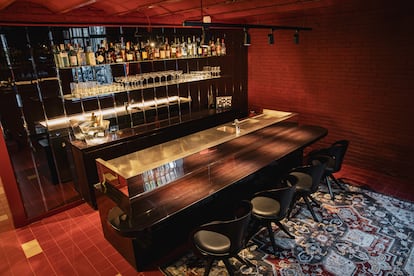 Només entrar, hi ha un petit rebedor pintat de color bordeus, presidit per una barra de fusta fosca on s’hi pot fer el primer glop. És un espai càlid, amb una estora d’estil persa que recorda les cases d’abans. El local segueix cap al menjador, petit, minimalista, però ple de detalls, com els quadres de Joan García Ripollés que ocupen un pany de paret i les butaques també en el mateix to vermellós que donen continuïtat a l’espai. Al fons, després de passar pel costat de la cuina, que no és vista però passant es pot veure perfectament, hi ha un pati on regna la pau. És un lloc per fer-hi el cafè o una copa, i on també descansen en un racó les caixes de taronges i mandarines que li porta el seu pare del poble.
