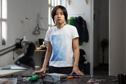 Li pregunto: el que crees es relaciona d’alguna manera amb la Xina? “Sí, perquè per a mi la producció artística és com quan un cos es posa a treballar tant que cau desplomat, tant per cansament com per orgasme”. I continua rumiant en veu alta: “També faig formes molt repetitives, petites, detallistes, que penso que són una cosa molt asiàtica. La meva pràctica artística és molt tech: treballo molt amb electrònica i compro molt per Ali Express. Tota l’electrònica que faig servir ve de la Xina”.