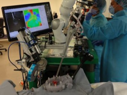Los robots cirujanos no operan; los que operan, con su asistencia, son los cirujanos o las cirujanas. Para resumir podríamos decir que se trata de un sofisticadísimo bisturí que el médico no necesita sujetar con sus manos y que incorpora cámara, pinzas, aguja y el resto del instrumental que se necesita en una intervención. “Antes operábamos con cirugía abierta”, resume Ana Belén Cuesta, cirujana ginecológica del Hospital Rey Juan Carlos de Madrid que opera con robot desde hace cinco años. “Eso quiere decir que teníamos que abrir la cavidad abdominal. Después comenzamos a usar laparoscopia para que la cirugía fuese menos invasiva. Cuando surgió el robot a mí me entraron muchas dudas porque no le veía ventajas. Pero desde que opero con él he descubierto que sí suple las carencias de la laparoscopia”, dice.