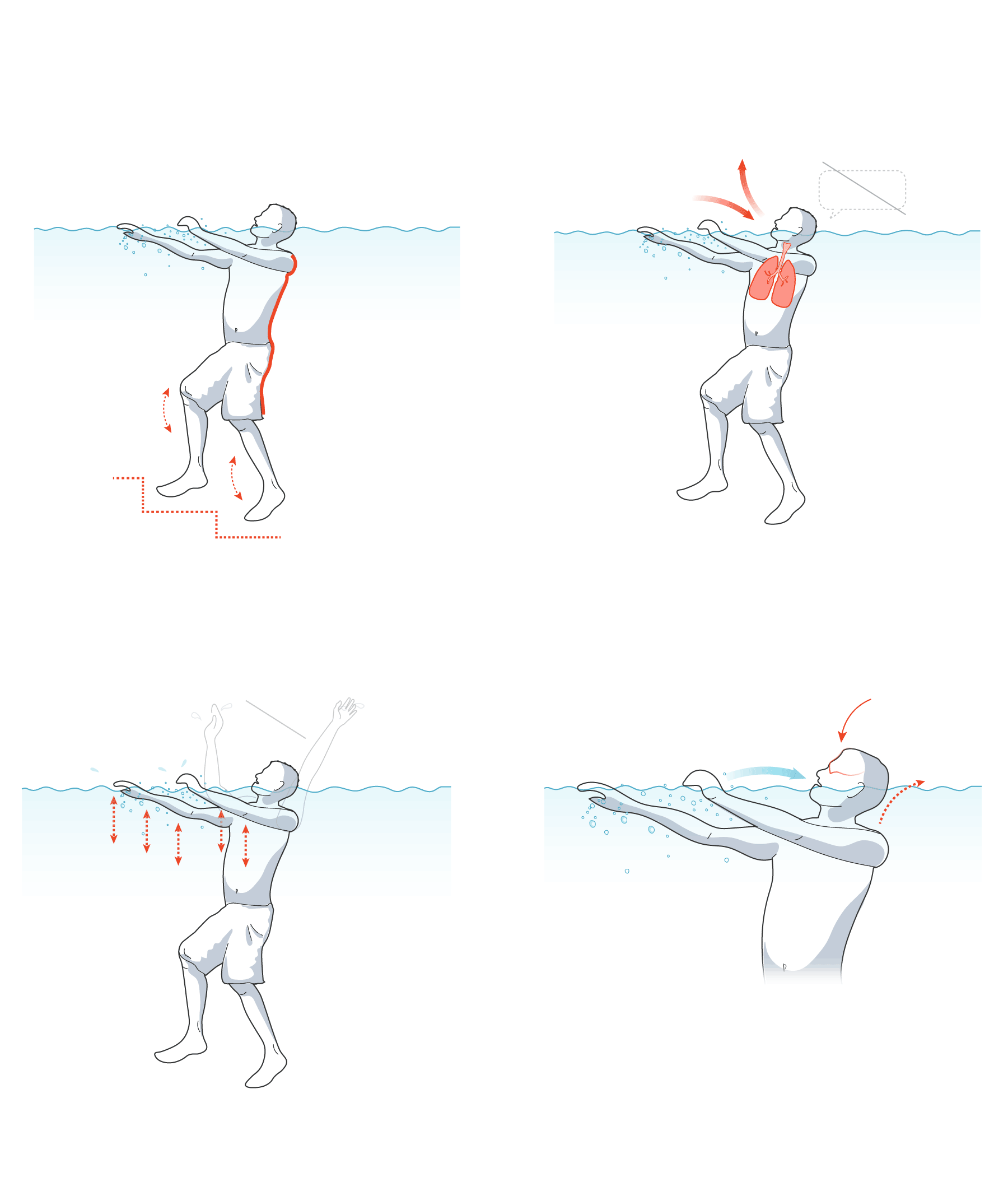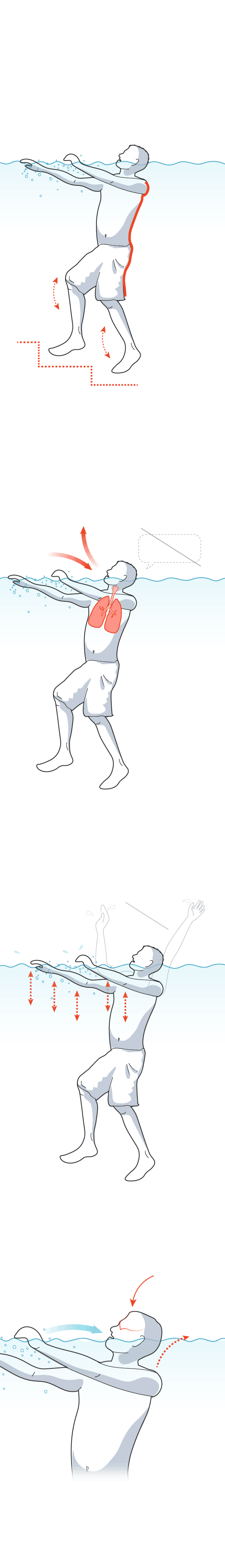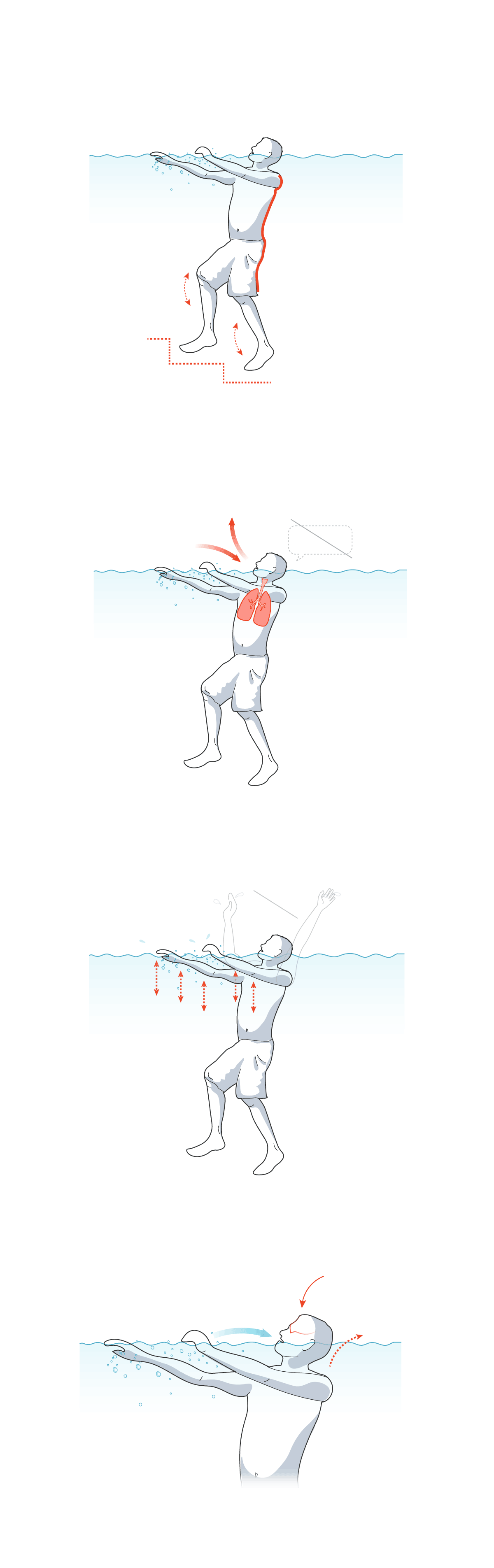 El cuerpo permanece en vertical en el agua, sin patadas de apoyo. Las piernas se mueven como si subieran una escalera.
