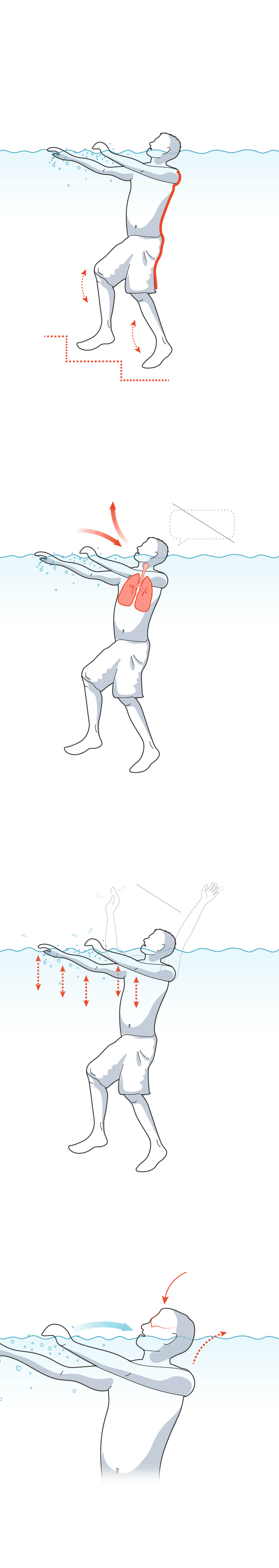 Los brazos están extendidos y presionan la superficie del agua. No pueden realizar movimientos voluntarios como pedir ayuda.