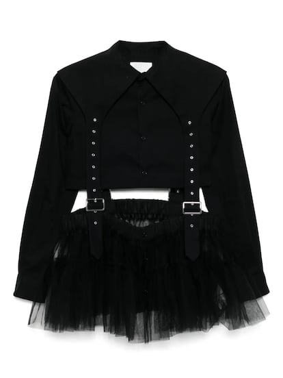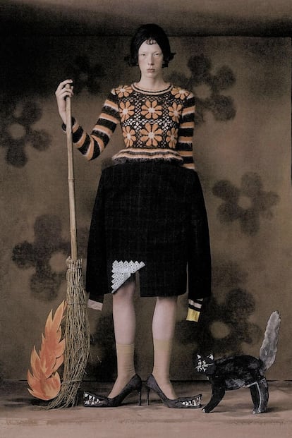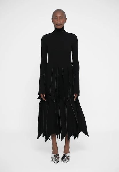 Sin necesidad de recurrir a un disfraz propio de la noche del 31 de octubre, la pasarela alberga un aluvión de propuestas para envolvernos por la belleza de la oscuridad durante todos los días del invierno. A esa estética del terror ‘contenido’ que viene defendiendo Comme des Garçons desde hace décadas —o el embrujo por lo etéreo de Simone Rocha— se suman también las siluetas de alta costura de Noir Kei Ninomiya. Fiel discípulo de Rei Kawakubo, el diseñador japonés ha elaborado entre notas románticas Y reminiscencias punk un uniforme urbano para brujas modernas semejante al de las diseñadoras Emma Chopova y Laura Lowena —más conocidas bajo el logo de Chopova Lowena— que secundan Katy Perry, Kaia Gerber o Emily Ratajkowski.