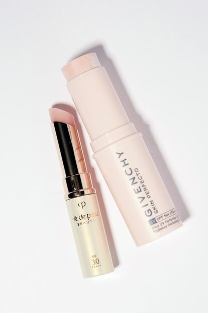 Para llevar. Formatos en barra para nómadas. Para labios, el Protective Lip Treatment de Clé de Peau Beauté, que combina protección y tratamiento (mejora textura, tono e hidratación). Por su parte, Skin Perfecto UV Stick de Givenchy, con un adictivo aroma floral y efecto glow, incorpora un cóctel con extracto de pimienta rosa, pomelo y vitamina C para reactivar la energía de las células cutáneas.