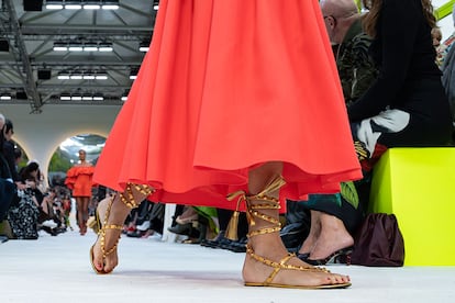 Dior calzó a todas las modelos de su desfile con zapato plano. Si bien otras temporadas alternaba sus kitten heel con otras opciones más cómodas, de cara a la primavera-verano 2020 Maria Grazia Chiuri, directora creativa de la enseña, apuesta por botas, alpargatas y sandalias que comparten la alergia a las alturas y abogan por el confort. No es la única gran firma que se ha pasado al zapato raso total. Aunque Valentino se sube este invierno a las plataformas y el tacón cuadrado, los cambia para el próximo verano por sandalias, en varias versiones, pero todas a ras de suelo. La lista de firmas que le han declarado la guerra al tacón sin excepción sigue con Hermès, Longchamp, Alberta Ferretti o la diseñadora china Uma Wang. Ni un solo tacón ha pisado sus pasarelas.