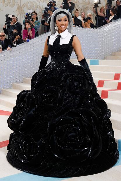 ‘El primer lunes de mayo’ marca cada año la inauguración de la exposición temporal más importante del Costume Institute en el Metropolitan de Nueva York. En una noche en la que la institución recauda gran parte de sus fondos anuales, el museo se engalana para acoger a celebridades de todo tipo y condición reinterpretando el tema anual. Esta vez, con una muestra dedicada a la figura de Karl Lagerfeld, los homenajes a su gata Choupette (heredera de parte de su fortuna) estaban asegurados. Hasta los últimos días un rumor afirmaba que el minino caminaría por la alfombra roja, pero la propia cuenta de Instagram dedicada a su figura se encargó de desmentirlo unas horas antes del inicio de la fiesta. Eso sí, la gata estuvo muy presente, especialmente en el atuendo que lució Jared Leto, una réplica exacta e inquietante de su suave pelaje.También quiso rendir homenaje a Choupette la rapera Doja Cat. En su caso con un vestido confeccionado para la ocasión por el director creativo de Oscar de la Renta, Fernando Garcia. La esponjosidad del pelaje del felino se combinaba con paillettes bordadas a mano en un diseño en el que el atelier de la firma trabajó durante seis meses. La cantante remató el estilismo con una prótesis que convertía su boca en un hocico, obra de la artista Melina Stearns. Los diamantes de Messika coronaron el conjunto.También inspirándose en Choupette, el rapero Lil Nas X. En su caso simplemente vistió un escueto slip y unas botas con plataforma, pero todo el peso del look recayó en el laborioso trabajo de decoración, obra de Pat McGrath. La célebre maquilladora necesitó nueve horas de trabajo y miles de cristales de todos los tamaños para conseguir este llamativo resultado. Concretamente 218.784 cristales de Swarovski.Más allá del minino, el recurso más repetido de la noche fue el de bucear en el archivo del prolífico Karl Lagerfeld. Penélope Cruz, anfitriona de la velada, lució un diseño de Chanel inspirado en el vestido de novia de la colección alta-costura primavera-verano 1988. En la imagen de la izda., un vestido similar de la colección prêt-à-porter de aquel mismo año.En una noche en la que venció la combinación de blanco y negro, Cruz no fue la única que recurrió a un vestido nupcial. También se quiso vestir de novia vintage Dua Lipa. La cantante se puso un diseño de la colección alta costura otoño-invierno 1992, un modelo que sobre la pasarela lució Claudia Schiffer. Lo completó con una nada discreta gargantilla de Tiffany & Co. con un diamante de más de 100 quilates.Uno de los homenajes más aclamados en redes sociales fue el de Nicole Kidman, que rescató el vestido que llevaba en una de las campañas más célebres de la maison: la dedicada al Nº5 que la actriz protagonizó en 2004. Aquel anuncio, con un presupuesto de 33 millones de dólares y dirigido por el mismísimo Baz Luhrmann, se convirtió en uno de los más caros de la historia, pero también en uno de los más recordados.En una noche en la que triunfó la teatralidad, no todo fue rebuscar en el archivo. La modelo Ashley Graham prefirió escoger un diseño antiguo de Lagerfeld, concretamente uno de la colección alta costura 1987-88 de Chanel, y pedirle a Harris Reed una reinterpretación. “Fue un gran logro poder inyectar el camp, el espíritu fluido de mi propia firma, con la clase y la gracia simple que Karl Lagerfeld aportó a sus diseños”, explicaba Reed en un comunicado de prensa.La Gala Met se presta al espectáculo y eso quiso regalar Florence Pugh. La actriz, que acaba de convertirse en imagen de Valentino, vistió de la casa italiana y remató su estilismo con un tocado escultural de plumas que atraía la atención sobre su cabeza, completamente rapada.Las camelias invadieron el estilismo de Cardi B, obra del diseñador chino Chen Peng. Una pieza que esconde más de 300 horas de trabajo en el atelier y 600 pétalos. La artista condensó el uniforme de Lagerfeld y lo hizo suyo: cuello de camisa, pelo blanco, acolchado, blanco y negro...Rihanna, embarazada de su segundo hijo, tuvo a toda la gala esperando y fue una de las últimas en pisar la alfombra que cubría la escalinata del museo (como ya es habitual en ella). También se decantó por rendir tributo a las camelias, pero ella con una espectacular capa de Valentino que requirió de la ayuda de muchas manos para poder hacer todo el recorrido.