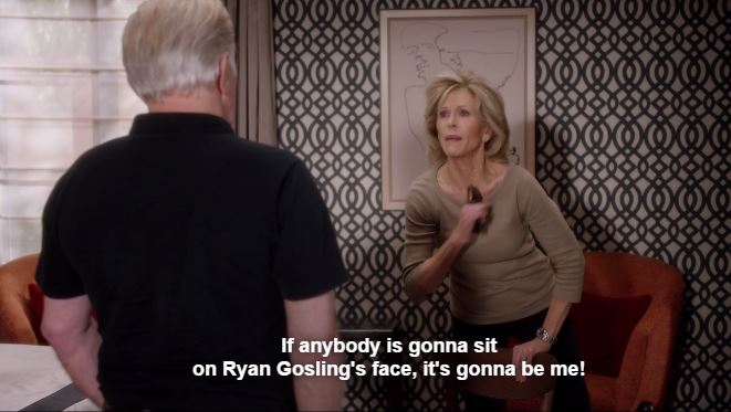 Basta con ver el primer capítulo de la recién estrenada Grace and Frankie (Netflix) para entender de qué va todo esto. Hablamos de la escena en la que Jane Fonda acaba de descubrir que su marido (Martin Sheen) es gay y que lleva 20 años liado con su socio (Sam Waterston). Su depresión se convierte en megacabreo cuando comprueba que el que hasta entonces heterosexual ejemplar ha comprado una silla con la cara impresa de Ryan Gosling en su asiento. Cuando le recrimina que por qué lo ha hecho, él contesta que es una broma privada con su amante. Ella, indignada, decide dejarlo con la palabra en la boca y se lleva la silla de la discordia. «¡Si alguien va a sentarse sobre la cara de Ryan Gosling soy yo!«, sentencia. Listo y empaquetado. Ya tenemos gag de la cultura pop para ejemplificar el posible fin de ciclo del fanatismo global con el protagonista de Drive. ¿Hace gracia la escena? Sí, obvio, son Jane Fonda y Martin Sheen (respect) hablando sobre poner su culo sobre la cara de Ryan Gosling, pero el chiste deja ese inevitable poso de llegar tarde. ¿No era eso lo que hacía todo el mundo entre 2011 y 2013, cénit de la Goslingmanía? ¿Cuándo se podían comprar almohadas con la cara de Ryan Gosling, colorear libros de Ryan Gosling, cuando los Tumbrls del Ryan Gosling feminista (y múltiples sucédaneos) o los Vines del actor negándose a comer cereales alimentaban tu feed de Facebook, Twitter o cualquier red social existente? ¿No ha pasado Internet, y el mundo, página con esa nueva hornada de cumberbitches y hiddlestoners, con un nuevo orden rendido a la nueva masculinidad de Aziz Ansari y viendo cómo ahora las webs se enternecen con Chris Pratt corriendo con tacones o Channing Tatum haciendo voguing?
