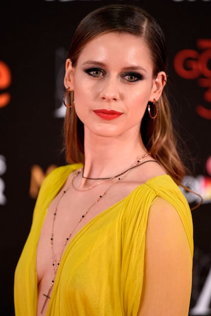 La actriz, que brilló con un vestidazo amarillo de Cortana, apostó por aros coronados por una discreta cruz y repitió motivo con un largo collar que parecía una especie de Rosario.