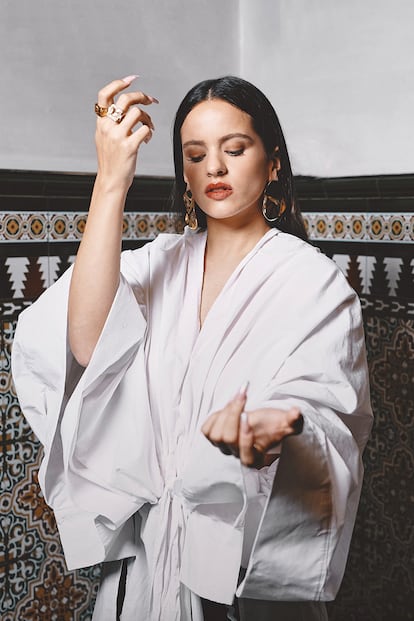 «Me siento afortunada, me da la sensación de que todo el trabajo realizado a lo largo de estos años cobra ahora sentido», asegura Rosalía. Ella no afloja el ritmo, persiste en el trabajo. Justo un día después de la entrevista lanzará el vídeo de su nuevo tema, Aunque es de noche, una versión del tema de Enrique Morente inspirado en los versos de San Juan de la Cruz. Lo ha dirigido Ignasi Monreal –ilustrador que ha colaborado en las últimas acciones de Gucci–, y en él la cantaora irradia una fuerza que en la pantalla se transforma en coloridas ilustraciones. De nuevo, tradición y vanguardia.