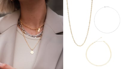 Para conseguir un efecto más auténtico se pueden utilizar diseños de distinto tamaño, tonos o longitud, como esta gargantilla en plata extrafina de Tous (a la venta en El Corte Inglés), una cadena larga bañada en oro amarillo (de PDPAOLA) o un collar metalizado y rígido, con superficie en textura, de Lefties.