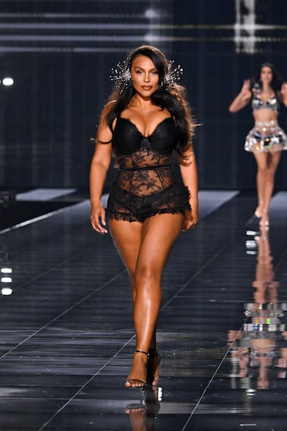 Karol G ha puesto una de las notas musicales del show, pero lo ha hecho con un mono de encaje que aunque abraza sus curvas, vuelve a ocultar la piel. Basta con echar un vistazo a los looks de Emily Ratajkowski o Bella Hadid para comprobar que cuanto más delgadas son las modelos, más minúsculos son los diseños que lucen. En su regreso el pasado año, la firma ya cometió los mismos errores, pues cuando modelos como Paloma Elsesser tomaron la pasarela, lo hicieron sin lucir la característica lencería que sus compañeras normativas sí llevaban. ¿Un ejemplo? Elsesser llevaba un gran lazo atado alrededor del abdomen. “Gracias por invitarme. Significa mucho para mí poder representar a las chicas con curvas en la pasarela”, dice Ashley Graham en sus redes sociales. Y aunque sus palabras son sinceras, y pese a que ella es de las pocas modelos que nunca cede a la presión estética que defiende el menos (peso) es más (poder), ese agradecimiento denota que para muchas, poder desfilar sin entrar en los cánones exige casi pleitesía. Supone un “gracias por dejarme existir”. Porque las curvas siguen siendo una excepción y para las marcas, un elemento de marketing. “El descarado tokenismo de apostar mujeres de talla grande que presentó la marca me pareció completamente anticuado. Ver a algunas mujeres allí que por primera vez se parecían un poco a mí no me hizo sentir guapa ni empoderada en absoluto. Simplemente enfatizó cómicamente lo anticuado y desfasado que es y siempre ha sido el estándar de belleza de Victoria ‘s Secret”, escribió el año pasado Nicola Dall’Asen en Allure. Y lamentablemente, poco o nada ha cambiado en el último desfile.