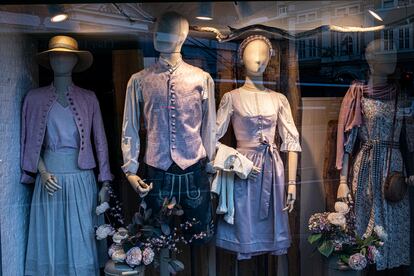 “Si llevas el lazo del delantal detrás muestras que eres viuda. En el lado derecho lo llevan las mujeres casadas, y a la izquierda las solteras, o las que tienen ganas de conocer a alguien”, nos cuenta Carolin Sinemus, que desde 2020 es la propietaria y diseñadora de la firma MADL, centrada en moda austriaca tradicional y trajes de alta costura. Su tienda, situada en el primer piso de un edificio de tres plantas, en la misma calle que la casa natal de Mozart –Getreidegasse– es además su taller de confección y su vivienda. Al entrar en la zona de exposición desmontamos un prejuicio: los diseños de los Dirndl y sus complementos no solamente vienen en tonos propios para salir de caza, sino en cualquier gama del círculo cromático: “Si te compras tu primer Dirndl ya de adulta, escoges algo clásico con esos colores supuestamente austriacos, pero aquí las chicas jóvenes llevan también otros de tonos vivos como rosa o amarillo, sobre todo en verano”, afirma Carolin.