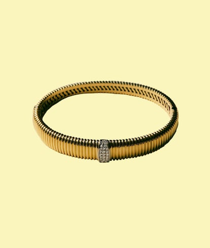 Atemporalidad y elegancia son las claves de la pulsera rígida de la colección Gallón, de la joyería Suárez. Es de oro amarillo y pavé de diamantes. (7.900 euros).