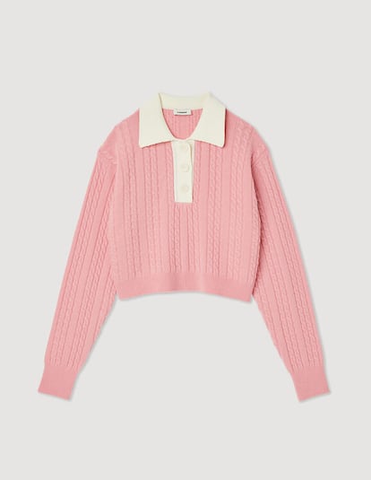 110€Si tu debilidad es el estilo preppy y los colores pastel, no puede faltar en tu armario este jersey de ochos en rosa chicle y con cuello en blanco de Sandro.
