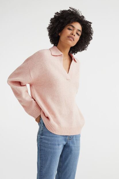 29,95€Si buscas aliado infalible para tus looks más relajados de vaqueros y zapatillas, lo encontrarás en este jersey de punto fino con cuello polo de H&M.