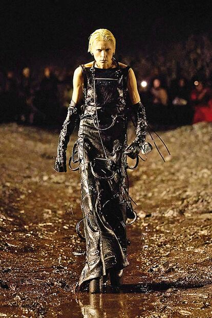 Hace 22 años, Miguel Adrover estuvo a punto de vérselas con Burberry en los tribunales por un “reciclado creativo”. La típica gabardina de la firma británica, vuelta del revés, el forro de cuadros a la vista, convertida en vestido a mayores titulares de la colección otoño-invierno 2000-2001 del mallorquín desencadenó el conflicto de intereses. “Fue el desfile que me hizo conocido y el primero que me trajo problemas”, recuerda siempre el indomable diseñador, que al final se comprometió con la marca a no volver a utilizar su característico check para evitar la demanda. Titulada Meettown, homenaje a Nueva York como intersección de gentes y culturas, la propuesta incluía además gorras de los Yankees y cinturones de Hermès reutilizados, guiño continuista a su debut del otoño-invierno 1999 (Manaus-Chiapas-NY) que subvertía los símbolos del capitalismo en la moda tratándolos como desechos. Ahí estaba, por ejemplo, aquella minifalda reconstruida a partir de un viejo bolso Speedy de Louis Vuitton que hoy habría sido saludada como una genialidad sostenible. “Todas sus creaciones prueban que Miguel tenía una visión que trascendía la mera vestimenta”, concede Gill Linton, fundador de la aplicación de compra de diseño vintage Byronesque.