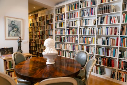 En una estancia adyacente al salón, el imponente gineceo: “Teoría feminista, poesía, lesbianismo, teoría jurídica, cartas y diarios, autobiografías y biografías, novelas, sufragismo, autoras contemporáneas, lo que han dicho los hombres sobre las mujeres...”. Y toda una columna dedicada a Virginia Woolf. En el centro, un sofá rojo coral y, a la izquierda, una pequeña mesa de madera con las cartas de Jane Austen publicadas en inglés, el diccionario María Moliner y bloques de post-its. “Esos tres tomos los acabo de comprar. Son de 1796 y son la novela Camilla, de Frances Burney, una autora que le encantaba a Austen”. Junto a ella, una pequeña silla de salón de baile suizo del siglo XVIII. “La compré en Lucerna (Suiza) durante una gira de Dover. Por aquel entonces viajábamos en un autobús con camas. Llegábamos a las ciudades por la mañana, desayunábamos en la sala y hacíamos la prueba de sonido. Lucerna es muy pequeña, cerca de la sala había un anticuario y allí la vi, la compré y la metimos en el autobús como pudimos”.