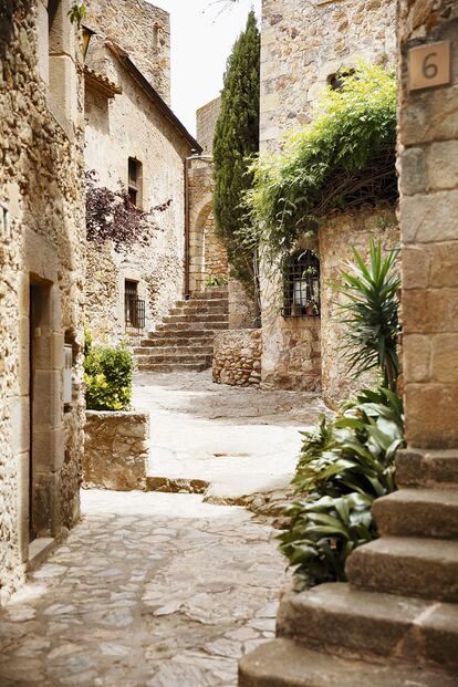Calle medieval de Pals que lleva a la Torre de les Hores, de estilo románico. Desde la zona más alta del pueblo se puede observar la llanura del Empordà.