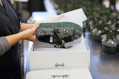 Eso sí, sin perder la esencia de la marca: elementos de fantasía (apliques brillantes, hilos metalizados y algunas lentejuelas) y elaboración artesanal. En la entrada de la fábrica se apilan las suelas de yute, que compran ya terminadas en Orihuela (Alicante). Javier, uno de sus artesanos, nos muestra cómo se hacían antes de que las máquinas facilitaran la tarea: el yute se enrollaba sobre un banco conocido como ‘alpargatero’ y después se cosía con un punzón. «Nos daba tiempo a hacer dos docenas en una jornada normal», asegura mientras atraviesa la suela con la gruesa aguja. Ahora las cosas van más rápido pero Vidorreta sigue apostando por mantener, en la medida de lo posible, las técnicas de siempre. Cortan las pieles y telas en la fábrica, montan el zapato y externalizan el toque final: son las mujeres del pueblo, experimentadas en el arte de coser alpargatas, las que puntada a puntada terminan cualquier modelo en pequeños talleres o en sus propias casas. «Cuando vamos a ferias internacionales, Inma y Mari, dos de nuestras costureras, nos suelen acompañar y causan sensación por lo rápido que cosen», asegura Pomar.