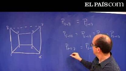Pésimo pronóstico para la hormiga del segundo de los desafíos planteados EL PAÍS para celebrar el centenario de la Real Sociedad Matemática Española (ver planteamiento en el vídeo de la izquierda). La probabilidad de que el insecto sobreviva en el problema planteado por el profesor Fernando Blasco, de la Universidad Politécnica de Madrid, es 0. Y tiene 4/7 de probabilidades de morir en el vértice 8 y 3/7 de morir en el vértice 7. Ya hay ganador del sorteo entre los acertantes de una biblioteca matemática como la ofrece cada domingo EL PAÍS. Esta semana ha sido Antonio Camacho, de Sevilla. Felicidades.