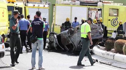 "Asómate a la ventana para ver lo que te mereces". Estas fueron las últimas palabras de F. J. B. C., de 51 años, a su exmujer. Eran las seis de la mañana de este lunes. Después de pronunciarlas estrelló su coche con su hijo de 10 años dentro contra una glorieta cercana, en el municipio grancanario de Vecindario. El vehículo comenzó arder y los bomberos tardaron más de seis horas en sacar los cadáveres carbonizados. La madre del menor ya había denunciado a su expareja varias veces por malos tratos.