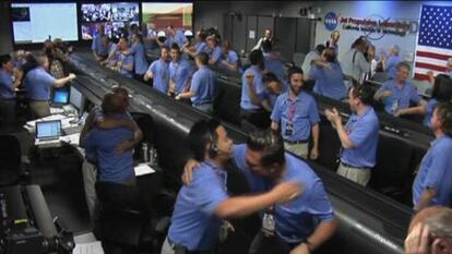 “Bienvenidos a Marte”, ha sido el saludo del director del centro responsable de la misión del Curiosity, Charles Elachi. El robot de la NASA ha protagonizado esta mañana una hazaña sin precedentes en la historia de la exploración planetaria: a las 7.32 (hora peninsular) ha tocado el suelo del planeta rojo superando la arriesgadísima maniobra de descenso. Pocos minutos después han llegado las primeras imágenes al centro de control en el Jet Propulsion Laboratory (California). En blanco y negro y de escasa calidad, han sabido a gloria a las decenas de ingenieros y científicos de la misión, que han explotado en aplausos, vítores, lágrimas, abrazos y euforia generalizada. “Los siete minutos de terror [del descenso] se han convertido en los siete minutos de triunfo”, ha dicho el director científico de la NASA, John Grundsfeld. Mensajes de parte del presidente Obama a través de su asesor científico John Holdren, allí presente junto al director de la NASA, Charles Bolden, y una alegría incontenible en medio de un ambiente festivo en el JPL demuestran el éxito científico y técnico de Estados Unidos, pero también su trascendencia política.