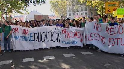 En Madrid, unas 40.000 personas, según el Sindicato de Estudiantes, unas 5.000, según la policía, han paseado desde Atocha hasta la Puerta del Sol unos gritos que resumen sus protestas, contra los recortes educativos y la subida de tasas universitarias, pero también contra la reforma escolar que impulsa el Ministerio de Educación y que, entre otras cosas, elimina el Bachillerato de Artes Escénicas. Contra esto han protestado en la manifestación, disfrazados de mimos, un grupo de alumnos de esa modalidad de bachiller del instituto público Lope de Vega, situado en el centro de Madrid. Junto a ellos, el secretario general del Sindicato de Estudiantes ha resumido los mensajes de la marcha: “Que el Gobierno del PP devuelva los 4.000 millones que le ha robado a la educación [lo recortado] en los últimos dos años y que se vaya el ministro Wert".